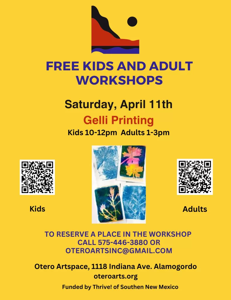 FREE Kids & Adult Workshops ⇐ Return to Calendar FREE Kids & Adult Workshops April 11, 202610:00 am – 3:00 pm Otero Artspace1118 Indiana AvenueAlamogordo, New Mexico 88310United StatesView LocationMap Otero Artspace Otero Artspace1118 Indiana AvenueAlamogordo, New Mexico 88310United StatesView Location