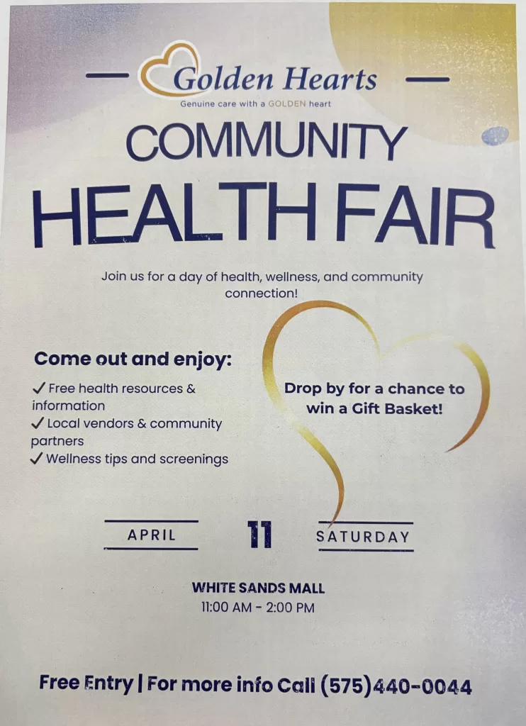Golden Hearts Community Health Fair ⇐ Return to Calendar Golden Hearts Community Health Fair April 11, 202611:00 am – 2:00 pm White Sands Mall3199 N White Sands BlvdAlamogordo, New Mexico 88310(575) 434-3990View LocationMap White Sands Mall White Sands Mall3199 N White Sands BlvdAlamogordo, New Mexico 88310(575) 434-3990View Location