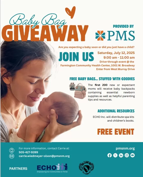 June 27, 2025 Baby Bag Giveaway ⇐ Return to Calendar Baby Bag Giveaway July 12, 20259:00 am – 11:00 am Farmington Community Health Center1001 W. Broadway, Ste. EFarmington, NM 87401505-327-4796View LocationMap Farmington Community Health Center