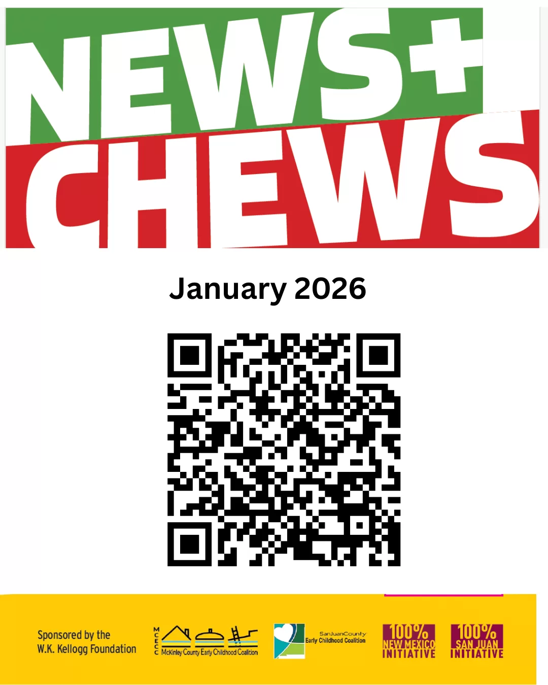 Discover the News & Chews newsletter, a fresh highlight of the 100% San Juan County Initiative—proudly sponsored by the W.F. Kellogg Foundation. Launched as a monthly digest, this engaging publication delivers bite-sized updates on our progress toward ensuring every family in San Juan County has the latest news tied to the ten vital services for surviving and thriving. Each edition shares Federal, State, and Local news impacting San Juan County families, paired with a SNAP-friendly recipe for practical, budget-savvy meals.